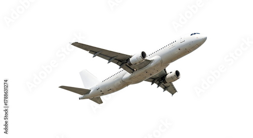 White commercial passenger jet airplane, flight viewed from below with engines visible, isolated on white or transparent background, AI