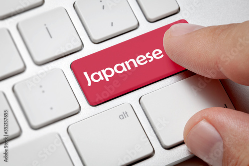 White computer keyboard and blue button against Japanese background.Male hand pressing Japanese written button on computer keyboard.