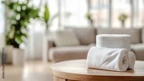 White container of multipurpose cleaning wipes, standing on a wooden table with blurred clean and organized living room.