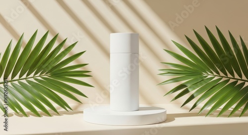 White Cosmetic Bottle on Pedestal with Palm Leaves and Shadows