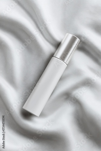 White cosmetic container tube lies on silky fabric background, top view, minimalist design