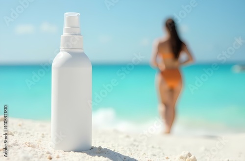 White cosmetics spray bottle mockup for liquids, lotion, oil or sunscreen standing on a sand. On the background is blue sea and running woman. Product demonstration or advertising.