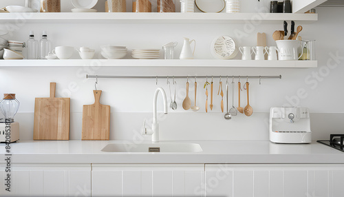 White counters with sink and utensils in interior of modern kitc