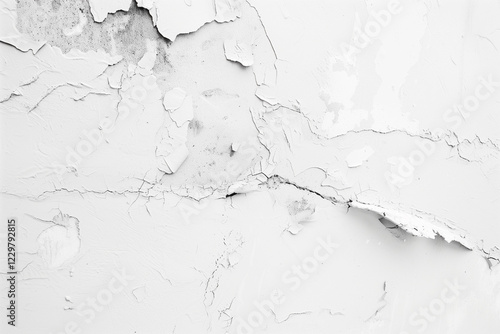 White cracked wall texture with peeling paint and rough plaster surface. Abstract grunge background for design, vintage aesthetics, architecture, and creative digital art projects. High-resolution di