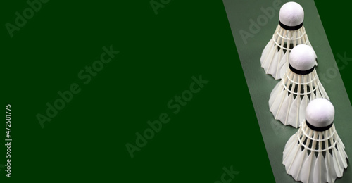 White cream badminton shuttlecocks on white lines of the green court, concept for badminton lovers around the world.