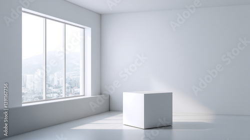 White cube in an empty white room with large window overlooking a cityscape with mountains in the distance