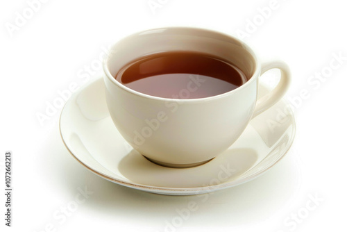 white cup filled with tea placed on a saucer, isolated on a clean white background