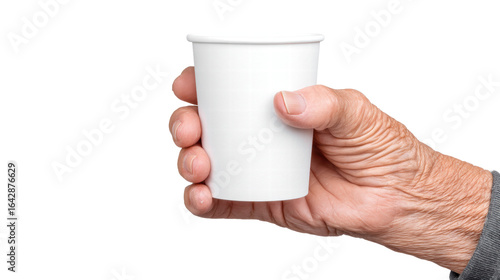 White cup isolated on transparent background held by elderly hand with wrinkles and gray sleeve