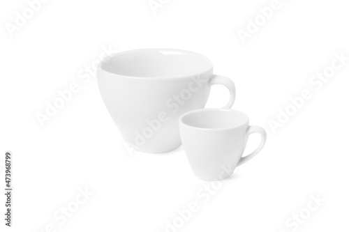 White cup isolated on white background. Ceramic coffee cup or tea mug for drink close up. Mock up classic porcelain utensils