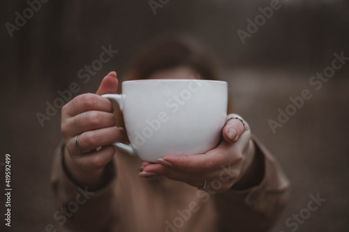 White cup mockup. A girl in the woods holding a white mug in her hands