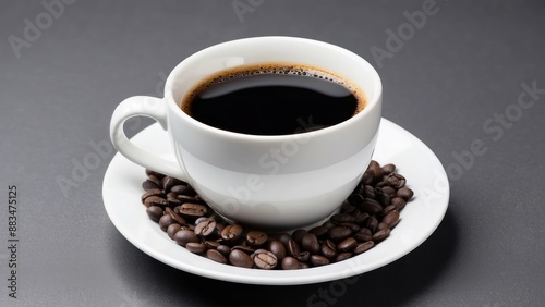 White cup of steaming coffee with beans on a gray background, invoking warmth and simplicity