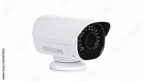 White cylindrical security camera with infrared LEDs and protective lens cover, mounted on base—symbolizing surveillance, safety, and modern monitoring technology.