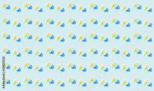 White dandelion inflorescences and shadow pattern on light shade of blue background. Summer Color Trends 2022, Attention-grabbing Palettes. Creative copy space for seasonal projects and basis designs.
