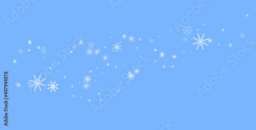 White delicate openwork snowflakes are scattered on a blue background. Festive background, postcard design, wallpaper