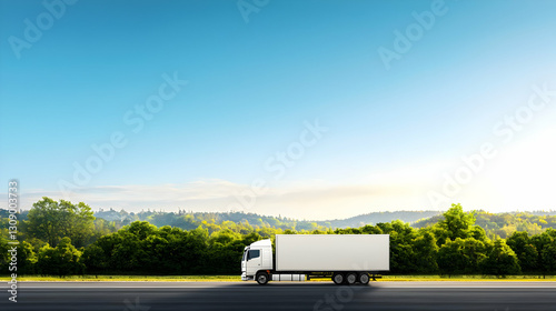 White Delivery Truck Driving On Asphalt Road Through Lush Green Landscape Under Bright Blue Sky