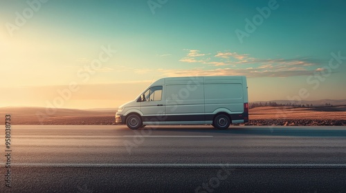 White Delivery Van Driving on Road at Sunset