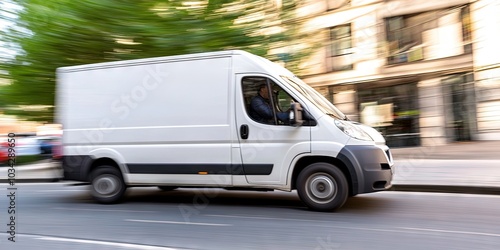 white delivery van driving through city at high speed