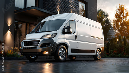 White delivery van parked in front of modern residential house for parcel service. Clean minimalist design vehicle on paved driveway, suburban setting. Transportation and logistics for e-commerce.