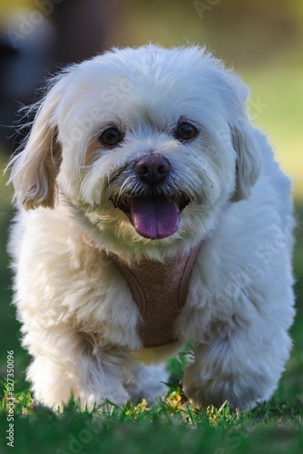 White dog joyfully runs on grass, tongue out