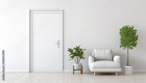 White Door Armchair and Plants in Minimalist Living Room Interior