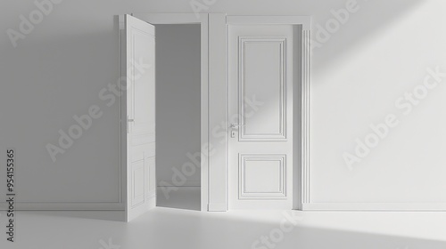 White door with ornate trim and a handle in a white room with light streaming through the window.