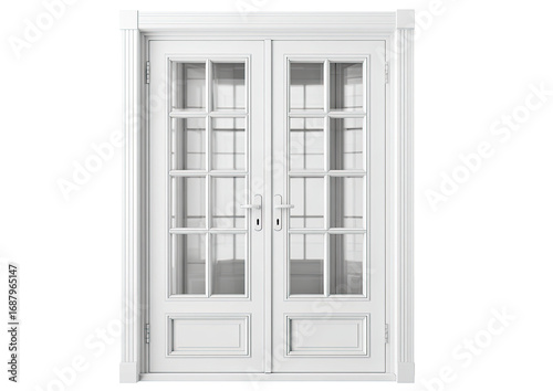 White double doors with glass panes. Front view of a classic, light-colored entryway door, featuring a grid pattern of small panes of glass within a frame.