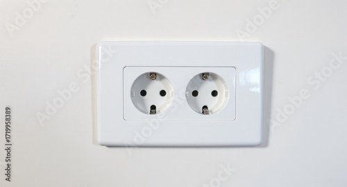 White double electrical outlet on a white wall. Two receptacles with small, light-colored screws are visible