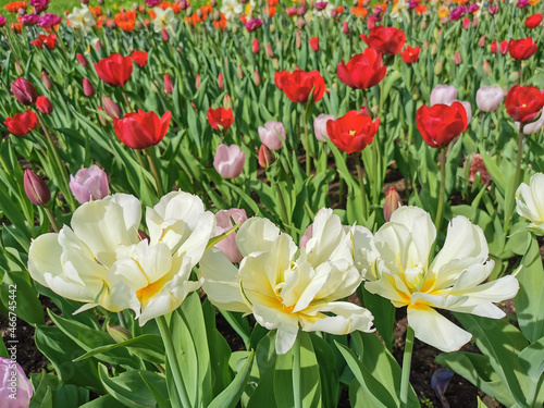 White double tulips with a yellow center on a flower bed with other tulips. The festival of tulips on Elagin Island in St. Petersburg.