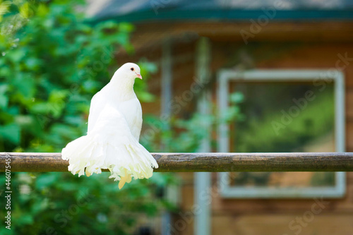 White dove sits on a branch against the background of a wooden house. Fantail white dove, pigeon