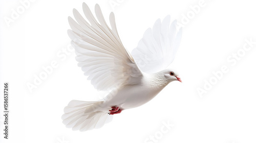 White dove soaring gracefully in flight. A white dove is soaring through the air with its wings fully spread, symbolizing peace and freedom.
