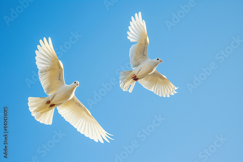 White doves soaring freely in a serene blue sky, symbolizing peace and freedom.