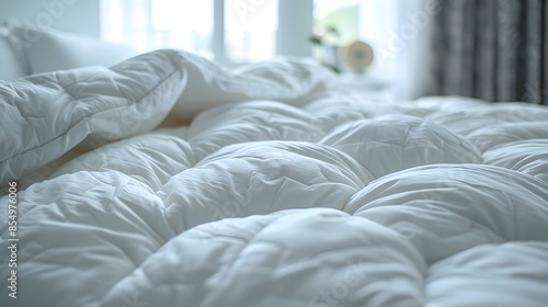 White duvet on bed in bedroom, closeup. Soft and comfortable texture of fluffy white quilt with empty space. Close up view of hotel room interior design in the style of macro shot.