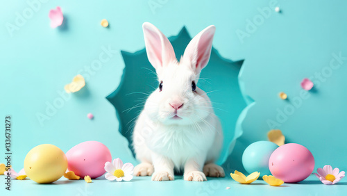 white easter bunny with easter pink, yellow and blue eggs and flowers around on blue background