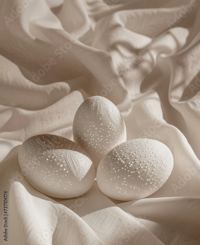 White Easter eggs elegantly decorated with zircons and precious gemstones on a soft white fabric. Easter luxury greeting card.
