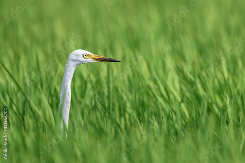 white egret hiding in a green rice field and looking for a prey
