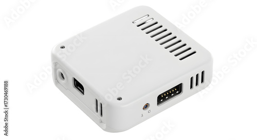 White Electronic Device with Multiple Ports and Vents on Smooth Light Surface