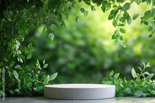 White empty 3d podium surrounded by greenery for displaying natural products. Promotion of natural cosmetics or beauty. Generated by artificial intelligence
