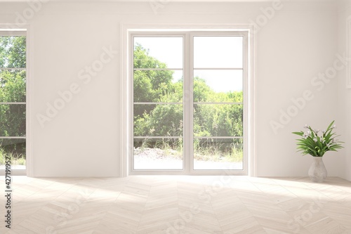 White empty room with summer landscape in window. Scandinavian interior design. 3D illustration