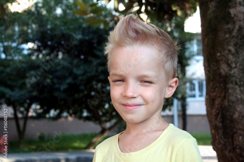White european young boy smiling or squinted and looking directly at the camera. Gender-neutral haircut