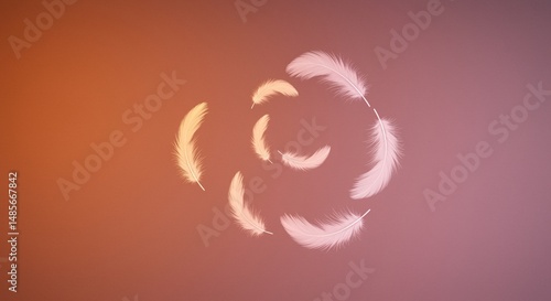 White Feathers Gently Floating on a Soft Orange Background creating a Circular Design perfect for peaceful backgrounds or design elements.