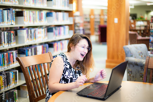 White female, Caucasian woman sitting at the desk with laptop. she is happy, smiling and looking on computer. Library or bookstore