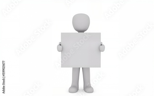 White Figure Holding Blank Sign Against White Background. High quality