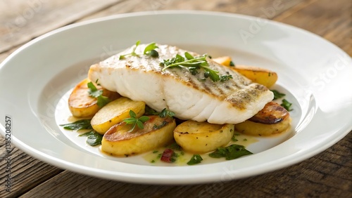 White Fish Fillet with Sliced Potatoes and Herbs on White Plate