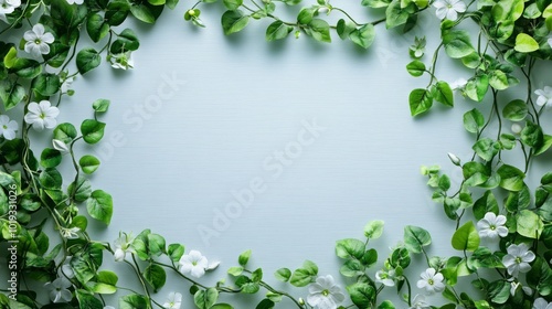 White Flowers and Green Leaves Bordering a Light Blue Background