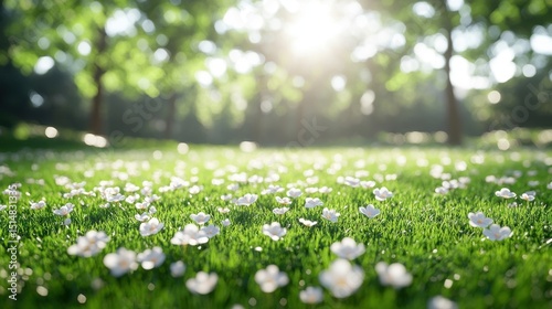 White Flowers in Lush Green Meadow Bathed in Sunlight within Tranquil Park
