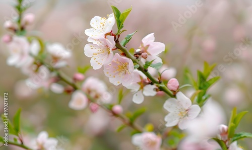 white flowers on peach branches with green leaves and pink buds, Generative AI