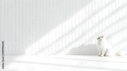 White Fluffy Cat Sitting on White Wooden Floor in Sunlight