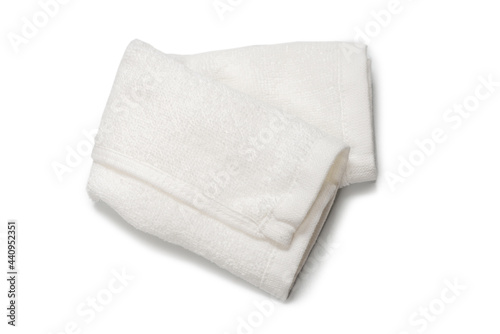 White fluffy cotton towel isolated on a white background.