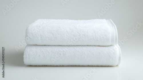 White fluffy towels neatly folded on white background. Clean, luxurious product. Ideal for spa hotel promotions. Pure white color, soft texture. Perfect for wellness product display. Great for