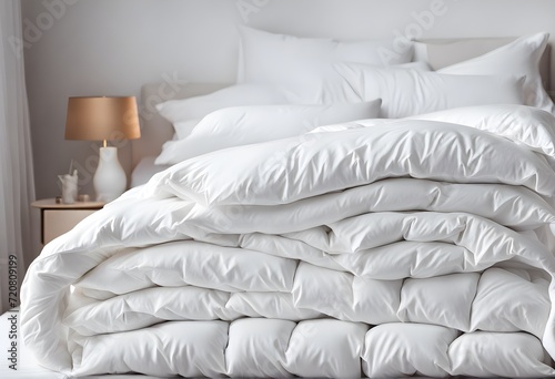 White folded duvet on white bed background. Preparing for winter season, household, hotel or home textile.. Healthy lifestyle and comfort concept
